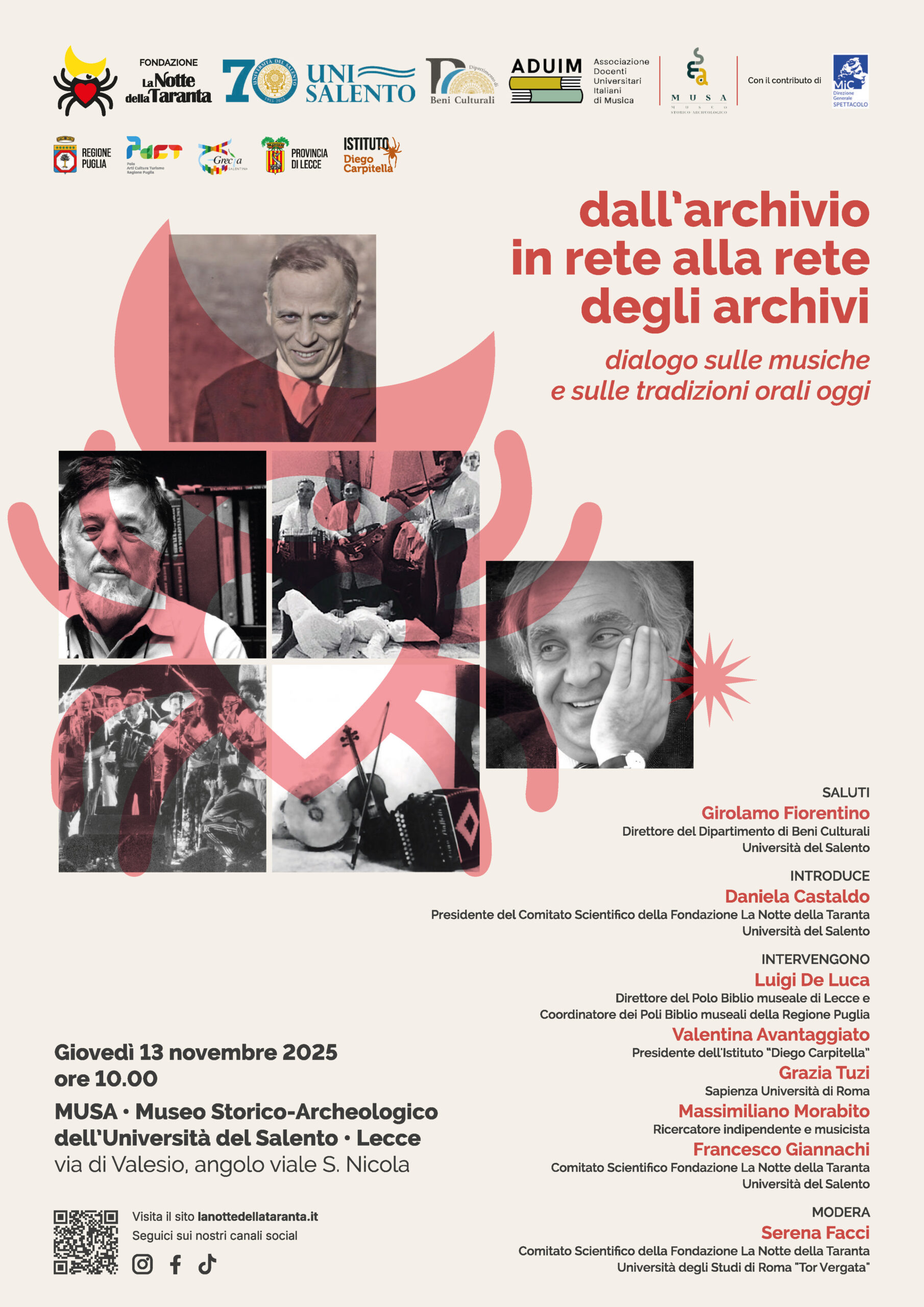 La Fondazione La Notte della Taranta, in collaborazione con l’Università del Salento e l’Associazione Docenti Universitari Italiani di Musica, promuove la giornata di studi Dall’Archivio in rete alla Rete degli archivi. Dialogo sulle musiche e sulle tradizioni orali oggi, in programma giovedì 13 novembre 2025 alle ore 10.00 presso il MUSA – Museo Storico Archeologico dell’Università del Salento (via di Valesio, angolo viale San Nicola, Lecce).
